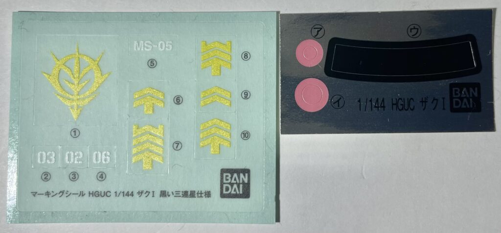 マーキングシールとモノアイ、ザクマシンガンのシールが付属しています。